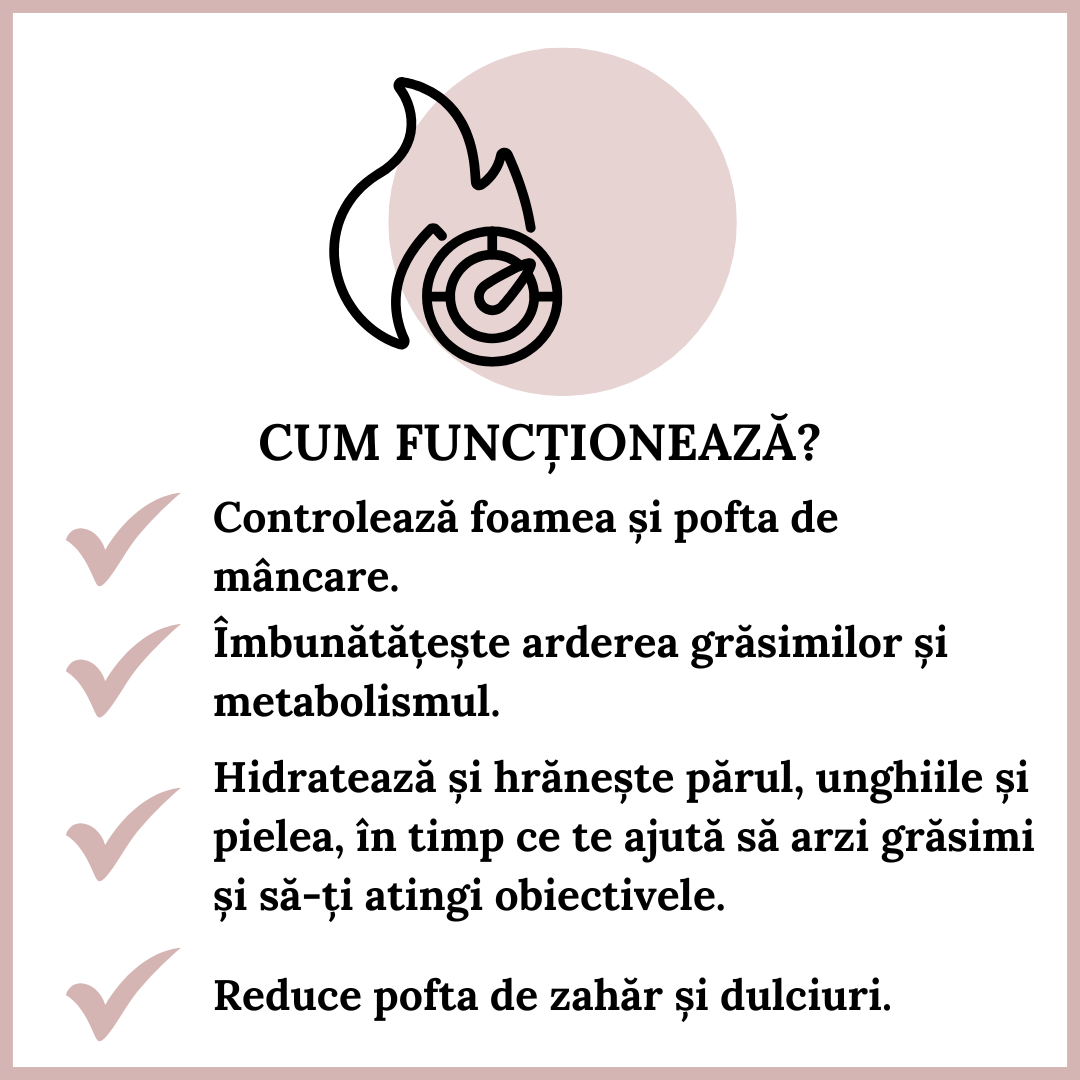 ✅ Funcționează pe mai multe niveluri hidratându-ți și hrănindu-ți părul, unghiile și pielea în timp ce arzi grăsimile și realizezi silueta visată